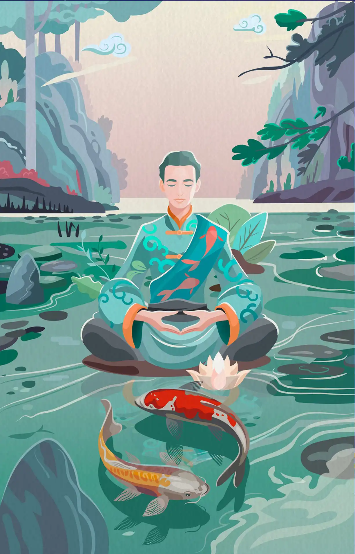 Arturo capta la paz que se alcanza cuando practicamos ZhiNeng QiGong y utiliza simbolismos importantes como son el loto blanco que hace referencia a nuestra capacidad de convertir los problemas en oportunidades para crecer y florecer a través de la práctica. Los peces (carpas koi) se consideran sagrados y espirituales; en el juego de su movimiento se expresan el Yin y el Yang, la información femenina y masculina en un constante juego y equilibrio que da fertilidad a nuestro movimiento.
